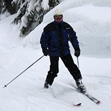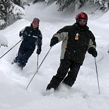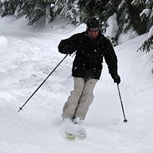 | Da es an diesem Tag weiterschneite, fuhr nur noch die hartgesottenen Schifahrer über die Tiefschneepisten am Diedamskopf. Ein besonderes Highlight, welches man nur von Nordamerika kennt, war am Nachmittag das knietiefe Pulverschneefahren an der Breitenalp unter der Leitung unseres Schiguides Daniel Huber. | ||