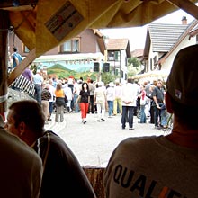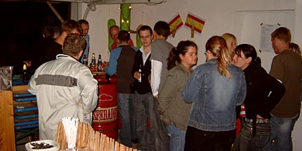 | So wurde Rainers Garage zur spanischen Bodega-Bar umfunktioniert. Neben Käse- und Schinken-Bocadillos (Baquette) und Desperados (spanisches Bier) hatte Rainer 4 erstklassige spanische Weine für den Ausschank ausgewählt. Palma Real (weiß), Villa Anitan (Rose') und Quinta Hinojal (rot-leicht) wurden gern getrunken. | ||