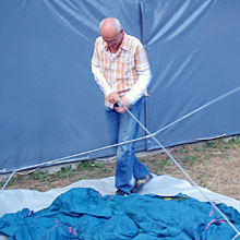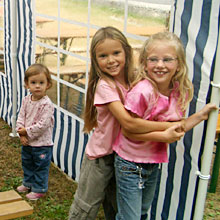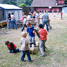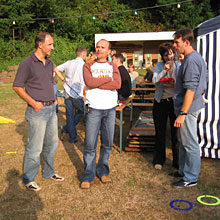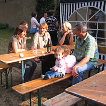 | Später am Abend stärkten sich die Gäste beim Abendessen für die kommende Nacht. Wie schon in den vergangenen Jahren, bauten auch diesmal wieder viele Erwachsene mit ihren Kindern die Zelte auf. Schließlich standen 7 Zelte zur Übernachtung bereit. Waren diese in den vergangenen Jahren noch klein und unbequem, so sah man dieses Jahr meist große und gut ausgestattete Unterkünfte. |