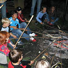 | Nachdem es Dunkel war, wurde ein Feuer in der Grillstelle angefacht und die Kinder konnten ihre Stecken mit Stockbrot in die Glut halten. Das machte allen sichtlich viel Spass. Hatte man bis dahin Glück mit dem Wetter, so begann es dann leider doch zu regnen. Einige verschwanden gleich in ihre Zelte, andere machten es sich in der Schießhalle bequem und man saß noch lange in gemütlicher Runde zusammen. |