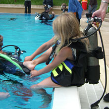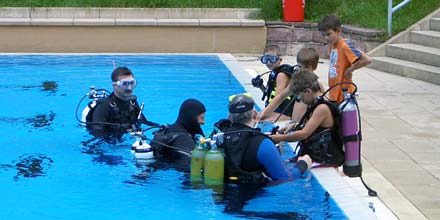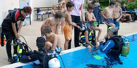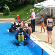 Nachdem sich die ersten Kinder unter Anleitung der Helfer Brille und Flossen angezogen und den Tragegurt mit Sauerstoffflasche umgeschnallt hatten, ging es nach letzten Anweisungen des Begleittauchers auch schon in jeweils 3 Zweiergruppen los. Da an diesem Tag nur wenige Badegäste im Schwimmbad waren, konnte das gesamte 50m-Becken genutzt werden. |