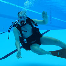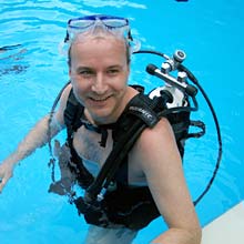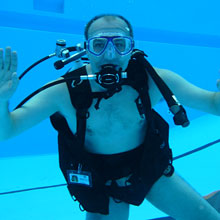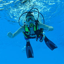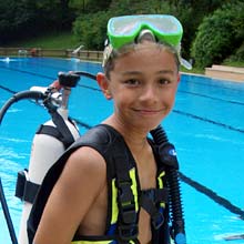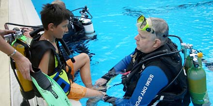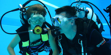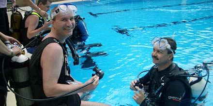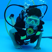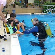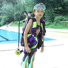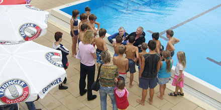 Ohne Berührungsängste mit der ungewohnten Ausrüstung, tauchten die Kinder begleitet von den Tauchlehrern längs und quer durchs ganze Becken und sogar hinab bis an die tiefsten Stellen. Verschiedene Ringe und Schaumstoffnudeln, mit Bleigewichten beschwert, bildeten einen kleinen Parcour, den die Kinder durchtauchen konnten. Eine spezielle Unterwasserkamera fotografierte die Kids bei diesem besonderen Erlebnis. |