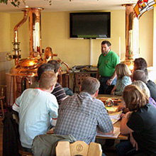 Vom Malz-Silo über die Schrotmühle / Maischpfanne / Läuterbottisch / Hopfenzugabe in der Würzepfanne / Whirlpool u. Würzekühler, Hefezugabe im Gärtank bis hin zum Lagern und Abfüllen konnten wir bei einem Rundgang – geführt vom Braumeister persönlich – die Braukunst in groben Zügen kennen lernen. |