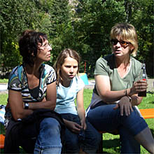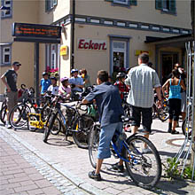| In Baiersbronn angekommen versammelte man sich am Bahnhofs-vorplatz. Einige mussten sich bevor die Fahrt losging erst noch stärken. Danach machte man sich fahrbereit, und los gings. |