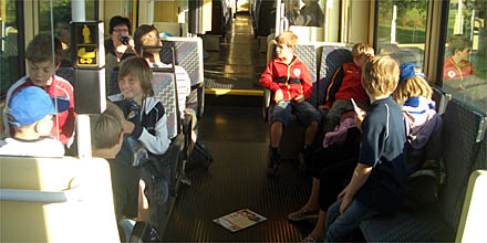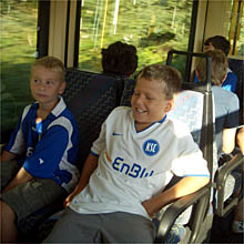 21 Kinder, die meisten natürlich mit Fankleidung, trafen sich mit den Betreuern der Spvgg um 7.40 Uhr am Bahnhof in Weisenbach um zuerst mit dem Bus nach Gernsbach und von dort weiter mit der Stadtbahn nach Karlsruhe zu fahren. |