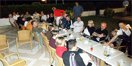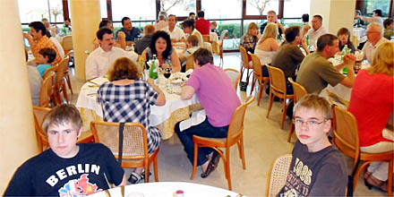 | Abends trafen sich aber alle wieder zum Essen im Hotelrestaurant mit herrlichem Blick aufs Meer. Die mediterrane Küche mit typischen Köstlichkeiten aus der Region verwöhnte die Gäste. Ein reichhaltiges Salatbuffet eröffnete die Speisefolge. Nach der Vorspeise mit Teigwaren oder Suppe, dem Hauptgang mit Fleisch oder Fisch war vor allem die hausgemachte Nachspeise ein besonderer Genuss. Die familiäre Atmosphäre des Hotels ist besonders zu erwähnen. |