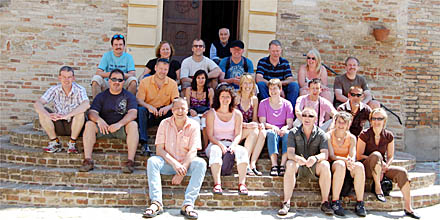 | Später fuhr man weiter durch das hügelige Hinterland zur imposanten Burganlage von Mondavio. Die Festungsanlage in mitten der Altstadt mit Stadtmauer aus dem 16. Jahrhundert lud zu einer Entdeckungstour ein. Den Tagesabschluss machte man bei einer Weinprobe auf dem Weingut Guerrieri. Zunächst wurde man, durch den ehemaligen Murgtäler und hier ansässigen Arzt Marcel Baumüller übersetzt, über den Weinanbau und Weinausbau informiert. Dann ließ man sich die leckeren Weine schmecken. Dazu wurde Weißbrot mit Olivenöl gereicht, was für sich schon eine kulinarische Köstlichkeit darstellte. |