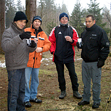 | Bei der Roten Lache nutze man die Heidelbeerwein-Pause um die am Abend geschmiedeten Pläne für einen "Biker-Stammtisch" in die Tat umzusetzen. Zukünftig möchte man sich zwanglos alle 4-6 Wochen zu einem Ausflug mit Moped, Fahrrad oder sonst wie treffen, und anschließend gemütlich einkehren. Der 1. Termin steht auch schon fest. Am 20. März spielt um 20:30 Uhr das Gitarren-Trio "The Gab" im Pub in Obertsrot. Die 10 Gründungsmitglieder legten am Höhenhotel bei -5°C um ¼ vor 11 den Grundstein dafür. |