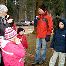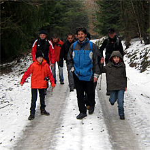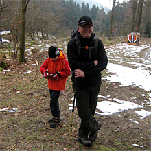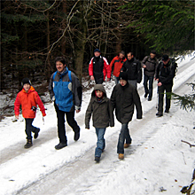 | Bei kaltem aber trockenem Wetter marschierte die Gruppe bestehend aus 8 Erwachsenen und 3 Kindern gutgelaunt vorbei am Sportplatz, Naturfreundehaus, Große Tanne, über den 1. Rankweg zur Hohbergwiese, wo eine erste Rast eingelegt wurde. |