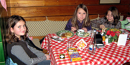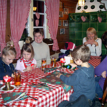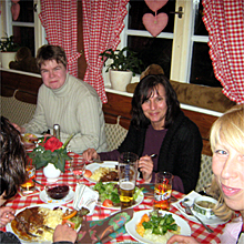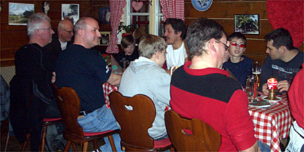 | Von innen gewärmt war die Strecke zum Scherrhof dann schnell geschafft. Insgesamt 25 Personen kehrten bei Anbruch der Dunkelheit in die wohlig warme Waldgaststätte ein zum Aufwärmen und Hunger und Durst stillen. An den spontan gebildeten Frauen-, Kinder- und Männertischen herrschte eine ausgelassene Stimmung und so verging die Zeit viel zu schnell. |