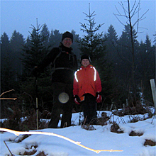 | Am späten Abend packte man sich mit Winterjacke, Schal, Mütze und Handschuhe für den Rückweg dick ein. Noch etwas flüssige Weg-zehrung eingepackt und ein Gläschen Heidelbeerwein für die unerschrockenen Wanderer zum Abschied, die sich nun mit Taschen-lampenlicht auf den glatten und teilweise vereisten Rückweg machten. So landeten einige ganz unverhofft auf ihrem Hosenboden. Ob das jeweils nur am Glatteis lag, weiß man nicht mehr so genau. |