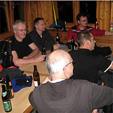 | Frisch gestärkt ging es dann nach Mitternacht gut gelaunt wieder hinaus in die Kälte. Zwar fehlten mittlerweile Mützen und Handschuhe und Rucksäcke wurden in der Hütte vergessen, aber das kann ja mal passieren. Dass es draußen glatt war, hatte ich ja bereits erwähnt. So gegen 2 Uhr erreichte man schließlich wieder Weisenbach. In Rainers Weinkeller fand dieser schöne Ausflug dann noch ein geruhsames Ende. |