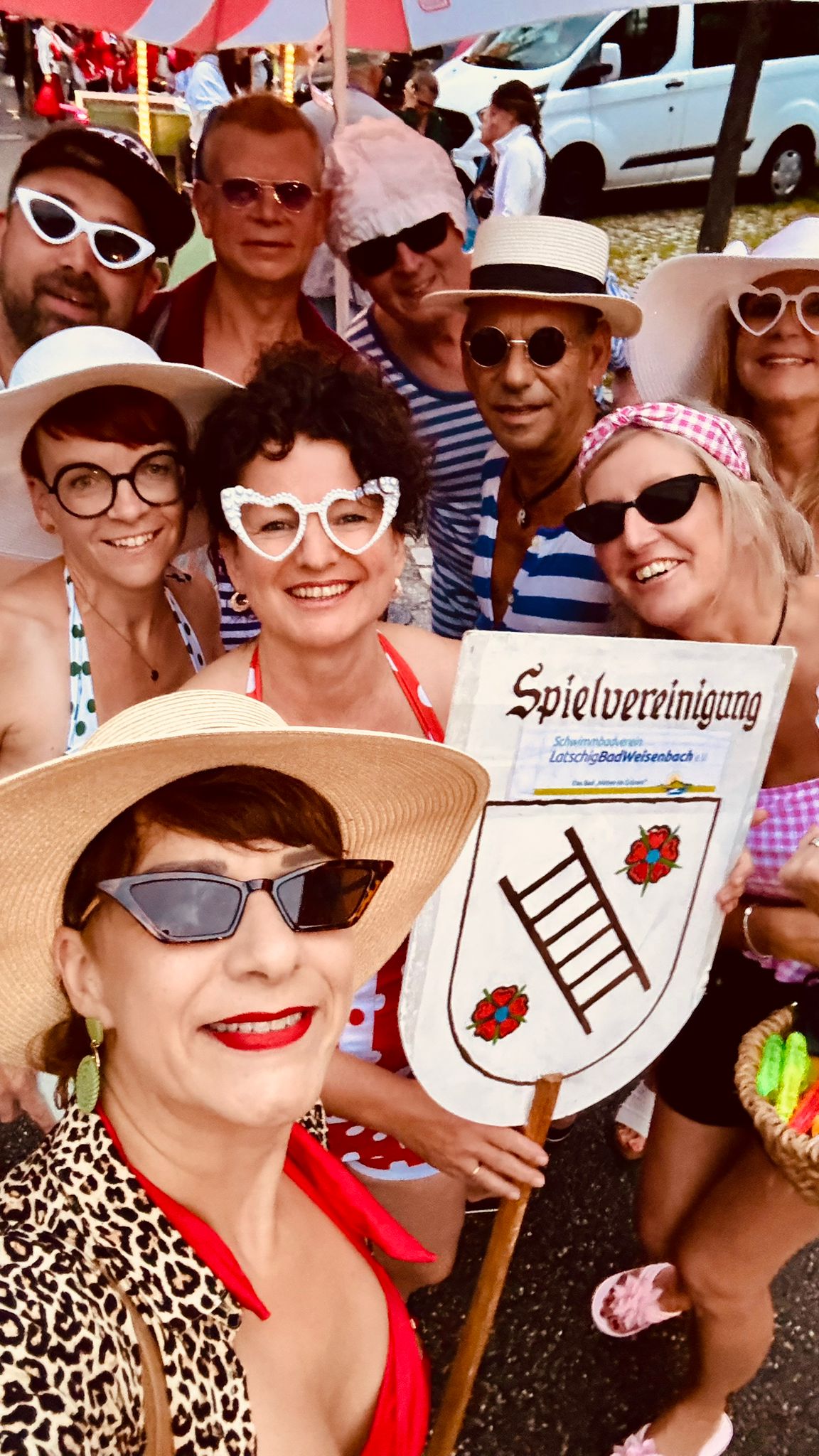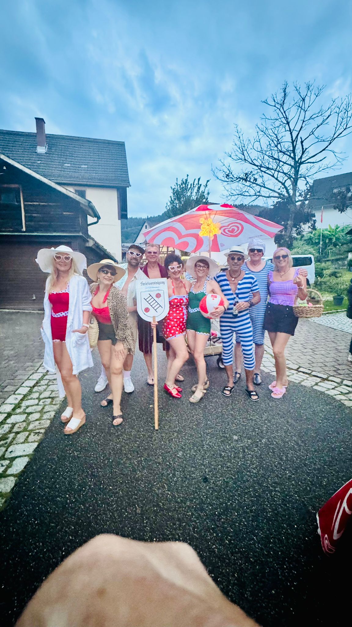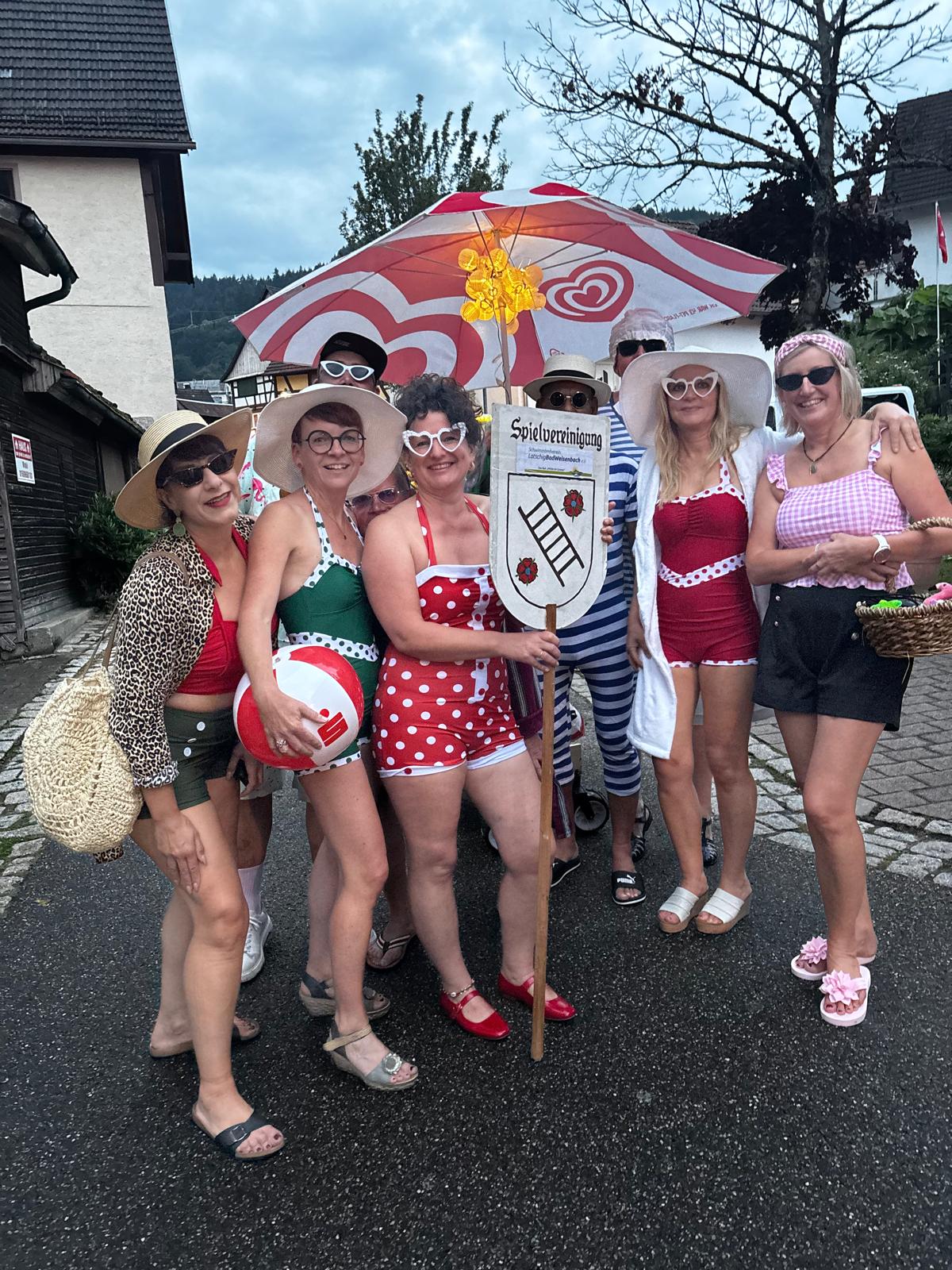 Beim Nachtumzug beteiligten wir uns auch mit dem Schwimmbadverein zusammen. Wir hatten das Motta Bademode der 50 ziger Jahre. Das Highlight am Samstagabend war der Liveauftritt von „Bettys Duo“ mit „Lilli“ u. „Lina“ , die etliche Besucher zu unserer Bodega-Bar anlockten. Die Garage und der Vorplatz waren bis auf den letzten Platz gefüllt und der Regen konnte, der Party nichts anhaben. So lief die Party bis in die frühen Morgenstunden und es wurde schon wieder hell bis die letzten Besucher ihren Heimweg fanden.
